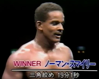 The fortunes of one Tatsuo Nakano lifted for the first time on the previous show, having bested Mark Rush aka Macduff Roesch (neither name is in the Cagematch database, this mystery is like an onion) in probably the worst UWF non-shootboxing bout to date. But his match-up against Norman Smiley does not bode well for his prospects of winning, with Smiley seemingly positioned directly beneath the Big Three of UWF (Maeda, Takada, Yamazaki) but above all others.